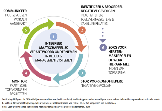Due diligence is een flexibel proces dat inspeelt op veranderingen in je strategie, bedrijfsmodel, activiteiten, (zakelijke) relaties en waardeketen. Dit proces beïnvloedt deze onderdelen ook actief. De UN Guiding Principles on Business and Human Rights en de OESO-richtlijnen voor multinationale ondernemingen laten zien hoe je dit proces uitvoert. Door de stappen te volgen en hier transparant over te rapporteren, maak je het due-diligence-proces van je bedrijf inzichtelijk. Hieronder vind je een schematisch overzicht van het due-diligence-proces volgens de OESO-richtlijnen.